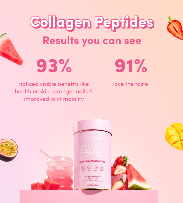 15 g Hydrolysed Collagen Peptides per serve, clinically sized at 2 kDa for optimal absorption, stimulating all three collagen types (I, II, III) for visible results you can feel. Available in four delicious flavours, including refreshing Passionfruit, Mixed Berry, Strawberry Watermelon & Unflavoured.