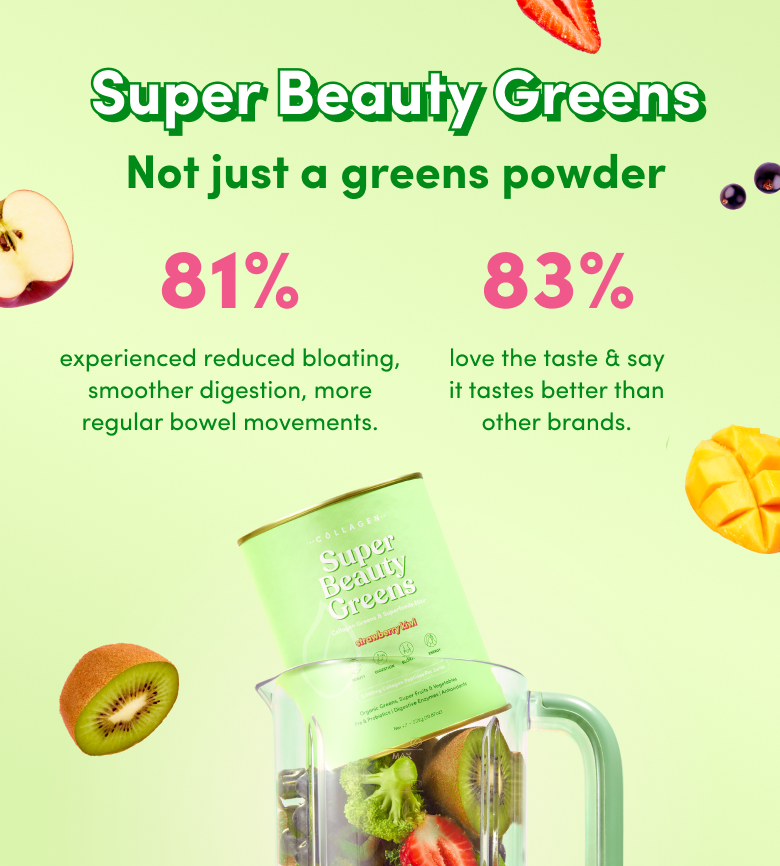 Super Beauty Greens combines 5 probiotic strains (5.6B CFUs) with prebiotics and digestive enzymes to support gut lining, balance microbiome, enhance nutrient absorption, and reduce bloating, gas, and indigestion.